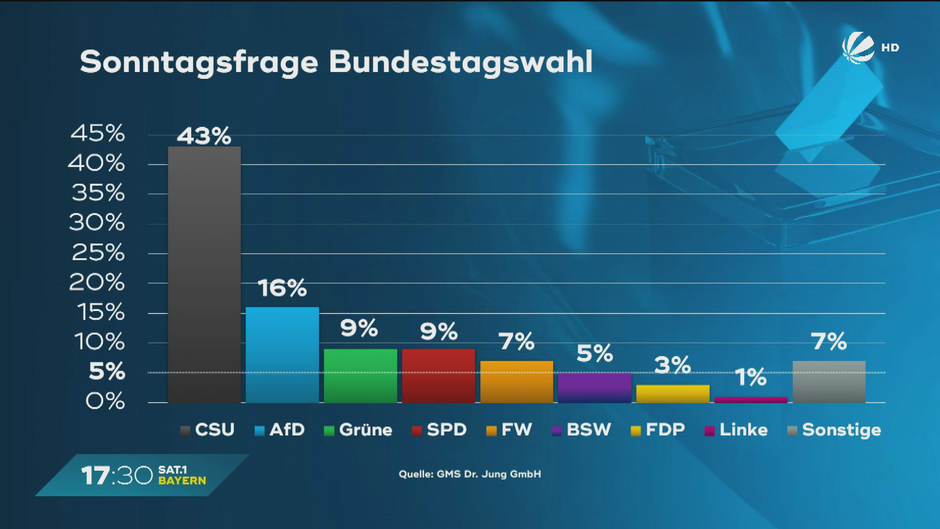 Der 17:30 SAT.1 Bayern Wählercheck im November 2024: Wie stehen die Wähler zum Ampel-Aus, den Neuwahlen und der zukünftigen Regierung? Eine aktuelle Wahlumfrage für Bayern.