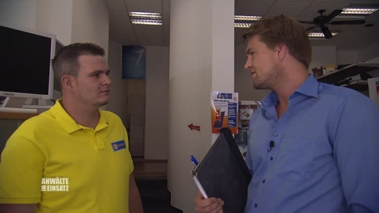 Anwalt Florestan Goedings begleitet seinen Mandanten in die Filiale der betrügerischen Telefongesellschaft...