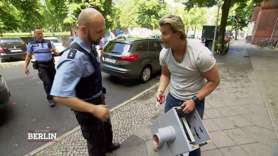 Die Beamten werden auf einen Mann aufmerksam, der am Straßenrand einen Blitzer auseinander baut. Auf Nachfrage reagiert der Mann mit wirren Ausreden...