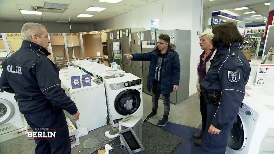 Eine Frau ruft die Beamten zu einem Elektroladen. Dort sind scheinbar mehrere Kunden gewaltsam aufeinander losgegangen. Die Beamten versuchen, die Situation zu beruhigen.