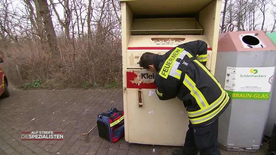 Die Rettungskräfte müssen eine Frau aus einem Altkleidercontainer befreien. Dabei zählt jede Minute, denn die Frau wird immer hysterischer.