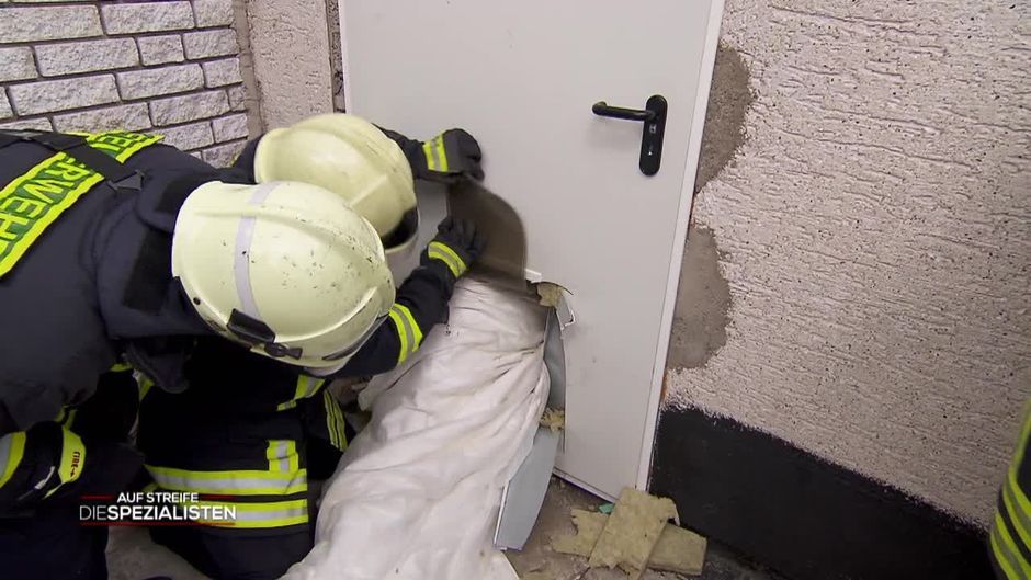 Die Feuerwehr versucht diesen Mann aus einer Tür rauszusägen. Ist er ein Einbrecher?