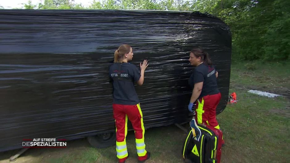 Die Sanitäter werden zu einem Wohnmobil gerufen, dass von außen komplett zugeklebt wurde.