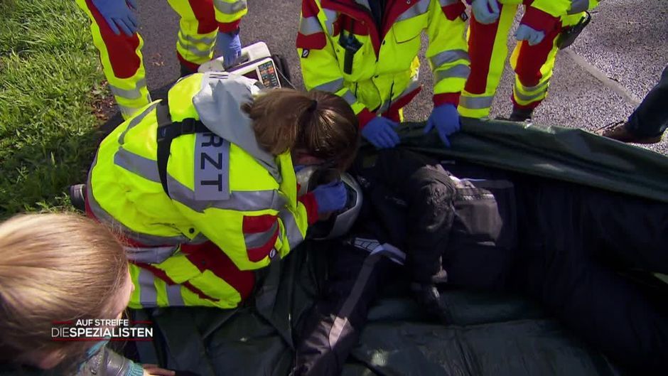 Die Rettungskärfte entdecken einen verunglückten Motorradfahrer - er ist beinahe komplett von einer LKW-Abdeckplane bedeckt.