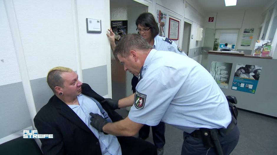 Ein Betrunkener torkelt auf die Wache Köln-Mülheim. Sein edler Anzug passt weder in Größe noch Stil zu dem Mann.