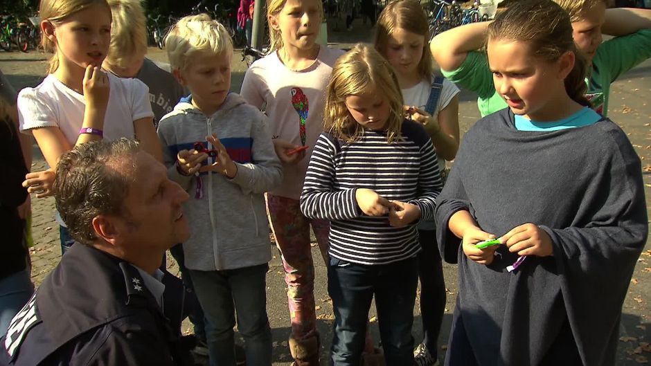 Martin Fuchs bespricht mit den Kindern die Gefahren eines Fidget Spinners und wie man richtig über einen Zebrastreifen geht.