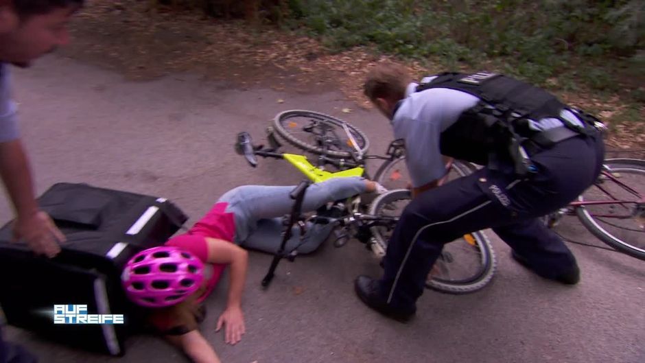 Zwei Fahrradfahrer fahren ineinander, weil eine Schlange den Weg passiert. Während die eine Beteiligte ihre Aussage macht, ist der andere verschwunden!