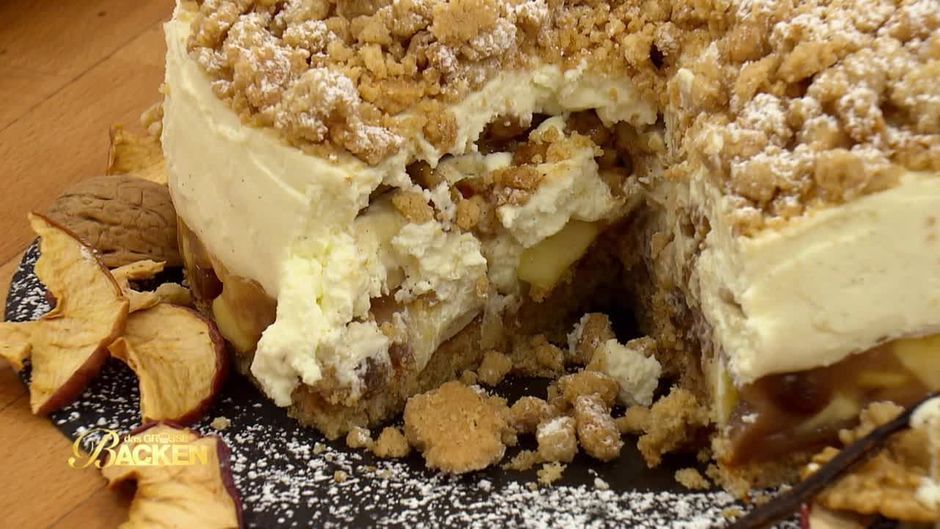 In ihrer Apfel-Nuss-Torte verarbeitet Laura einen Haselnuss-Ölteig sowie ein Apfel-Sultaninen-Kompott und eine Mascarpone-Creme. Verfeinert wird das Ganze mit einem Nuss-Crunch und Streuseln. Trifft sie damit den Geschmack von Betty und Christian?