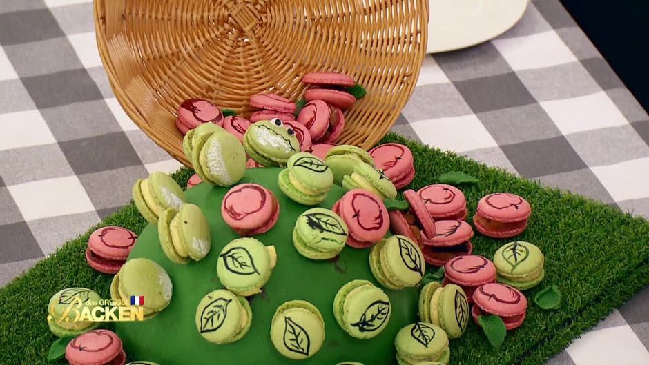 Steve hat für die kleine Raupe Nimmersatt aufgetischt. Auf der Karte stehen Macarons mit Apfelkompott und Palatschinken sowie Macarons mit Limetten-Basilikum-Creme und Ziegenkäse. Ob die Jury da wohl anbeißt?