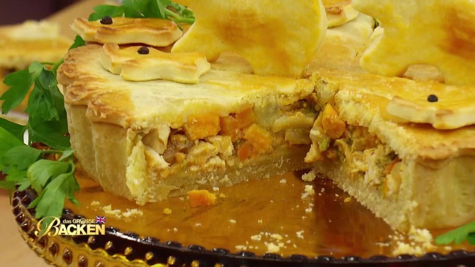 Gebackener Pie gefüllt mit einem aromatischen Curry, bestehend aus Hähnchen, Süßkartoffeln, Gemüse und Erdnüssen. Für eine besondere Note sorgen Rosinen. Als Dekoration dienen Elefanten-Plätzchen, die aus dem Pieteig ausgestochen werden.