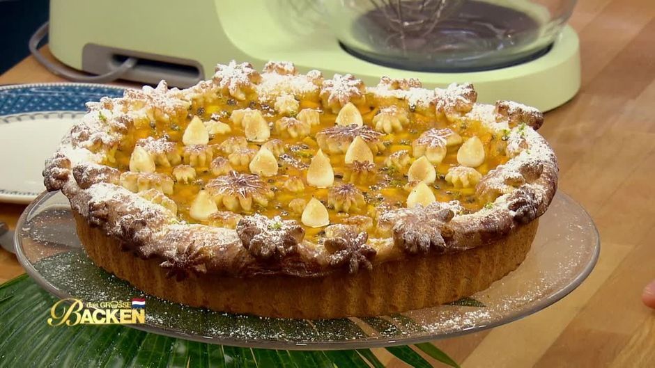 Ein exotischer Vlaai aus Hefeteig mit Kokospudding, Mango-Maracuja-Füllung und Kokos-Baiser wird von Kandidatin Jennifer präsentiert. Was wird die Jury zu diesem außergewöhnlichen Kuchen sagen?