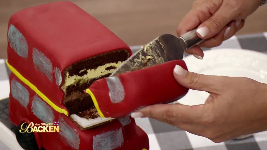 Im Look eines roten Doppeldeckerbusses versteckt sich ein Schokokuchen mit einer Orangenlikör-Creme sowie einer Schoko-Minz-Buttercreme. Als Fruchteinlage werden hier Orangenfilets verwendet. Wird diese Kombination bei Betty und Christian punkten?