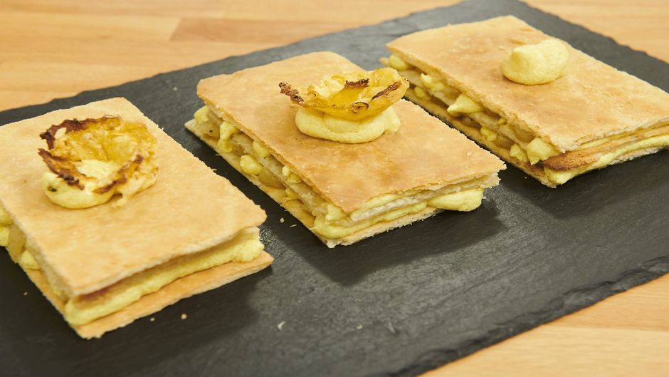 Barbaras Variation der Mille-Feuille sind Blätterteig-Schnitten mit Kurkuma, bestehend aus Ananasgelee, Limetten-Buttercreme, dekoriert mit gebackenen Ananasblumen. Doch reicht das für die Jury aus?