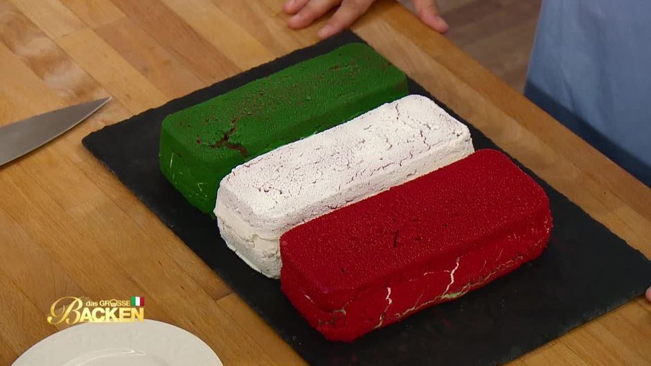 Kandidatin Barbara will die Italien-Flagge nachempfinden. Ihre drei Tiramisu-Blöcke bestehen aus einem Spinat-Ölteig mit Macarpone-Sahnecreme, Himbeeren, Pistazien und Litschi-Bubbles. Die drei Blöcke werden dann in den Farben Rot, Weiß und Grün angesprüht.