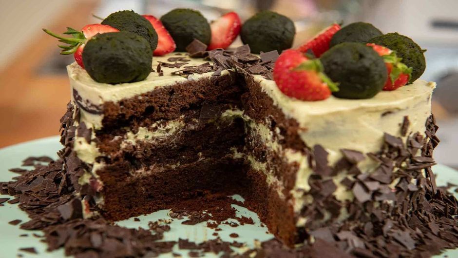 Mit einem saftigen Schokobiskuit und einer Matcha-Minz-Creme kreiert Jasmin ihre "Schoko-Minz-Harmonie", die sie noch mit Erdbeeren verfeinert. Optisch ist die Torte ein Hingucker. Doch kann sie auch geschmacklich begeistern?