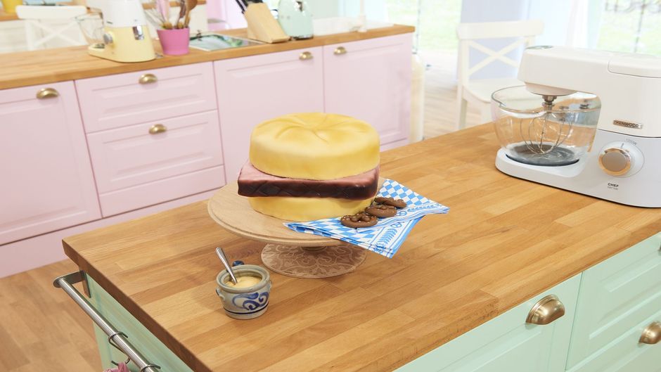 Michael kreiert eine Leberkäs-Semmel, der aus Eierlikör-Ölteig und Apfel-Marzipan-Kuchen mit Eierlikör-Buttercreme, schwarzer Johannisbeermarmelade und Eierlikör-Mousse besteht. Sein Kunstwerk kommt nah an das Original ran. Doch lässt sich auch die Jury tä