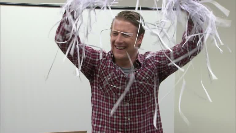 Gerrit, Robert und Cenk müssen sich durch Kistenweise Papierschnipsel wühlen - doch bloß keine schlechte Laune.