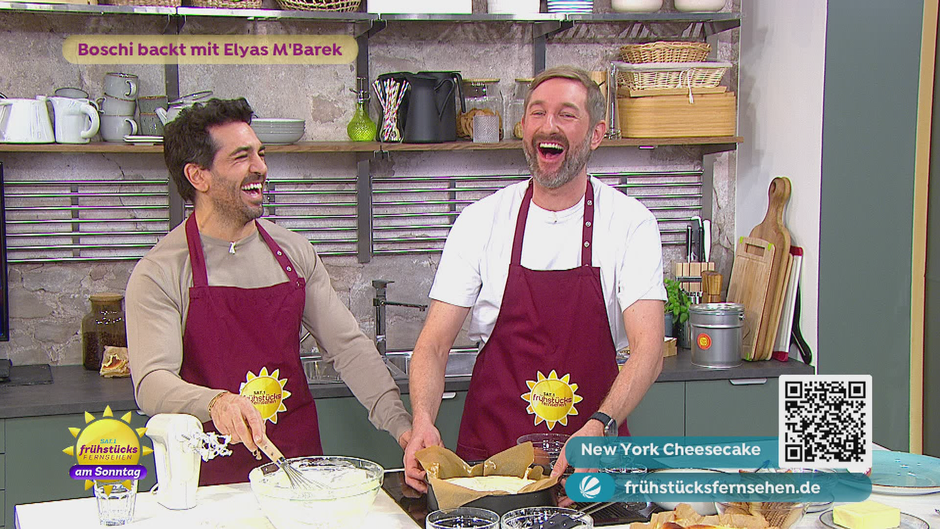 Boschi und Elyas M'Barek versuchen sich in der Küche am Backen. Es soll ein New York-Cheesecake werden. Wie sich die beiden schlagen und wie Sie den Kuchen nachbacken können, sehen Sie hier.