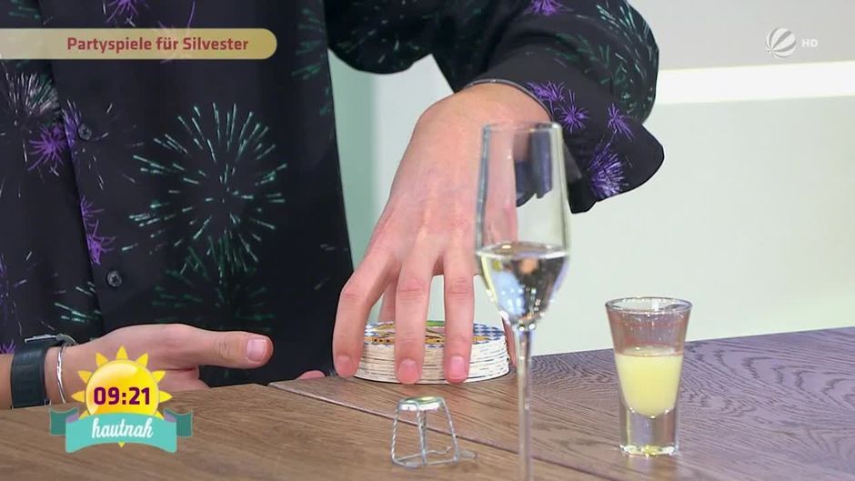 Ein bzw. mehrere Bierdeckel werden gestapelt an die Tischkante gelegt und sollen mit dem Handrücken in die Luft geworfen und dann wieder aufgefangen werden. Wer nicht fängt, muss trinken.