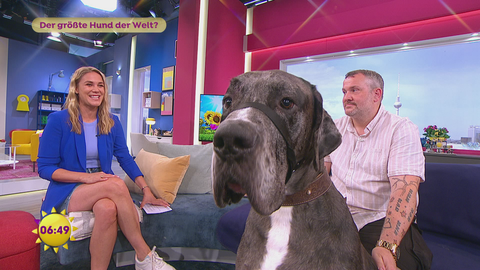 Kann sich Ramses den Titel "Der größte lebende Hund der Welt" holen? Besitzer Patrick Hein und seine Dogge sind heute zu Besuch im Studio. Alina hat Respekt vor dem großen Tier, ist aber dann sehr verzückt von dem lieben Ramses.