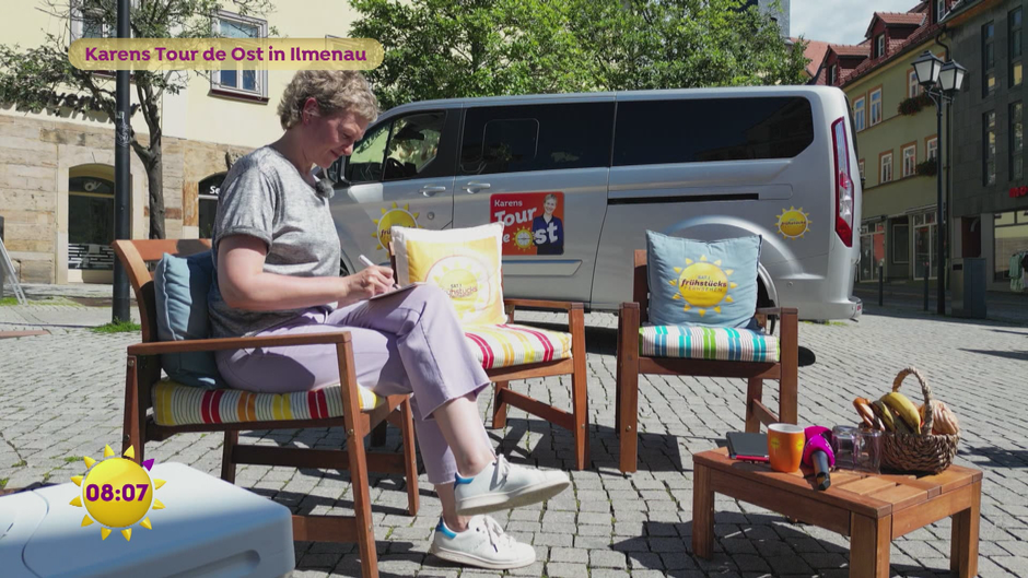Auf den Spuren von Goethe. Karen spricht mit den Menschen im thüringischen Ilmenau über die Wahl, ihre Lebenssituation und die hartnäckigen Vorurteile dem Osten gegenüber. Die Frühstücksfernsehen-Lounge ist für alle offen.