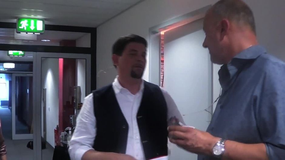 Tim, Frank und Cornelia machen sich backstage bereit fürs Studio. Tim verpasst Frank dabei den letzten Schliff.